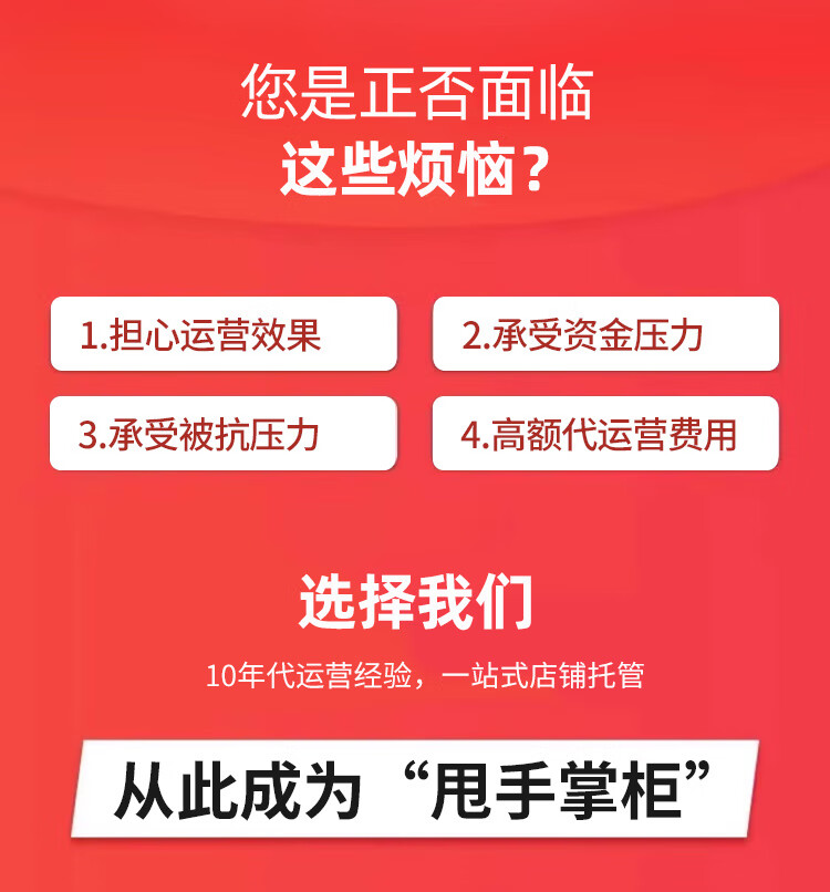 您是正否面临 这些烦恼? 1,担心运营效果 2.承受资金压力 3.承受被抗压力 4.高额代运营费用 选择我们 10年代运营经验,一站式店铺托管 从此成为“甩手掌柜”